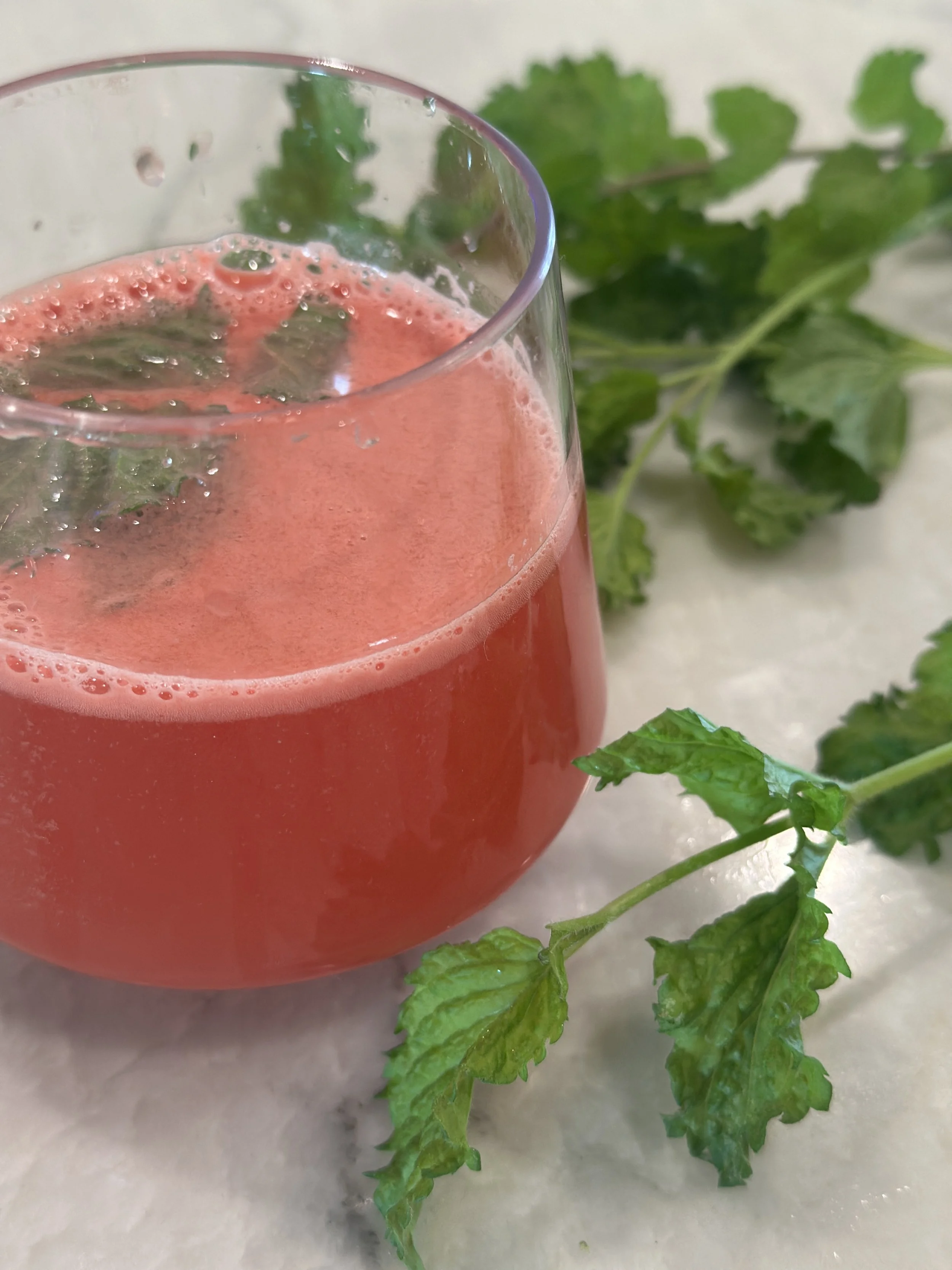 Blended watermelon, mint leaves, a squeeze of lime, and a splash of sparkling water. Pour it over ice and you’ve got sunshine in a cup.